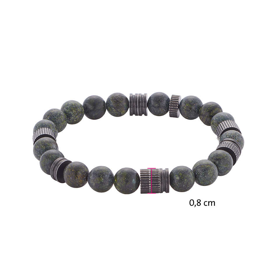 Tento flexibilní pánský náramek obsahuje malé vločky-obsidiánové korálky v různých odstínech zelené, které jsou kombinovány s ocelovými prvky. Ocelové prvky mají grafickou úpravu, která vytváří velice speciální vzhled tohoto kusu. Náramek je velmi přizpůsobivý, protože jej lze libovolně kombinovat s jinými náramky.