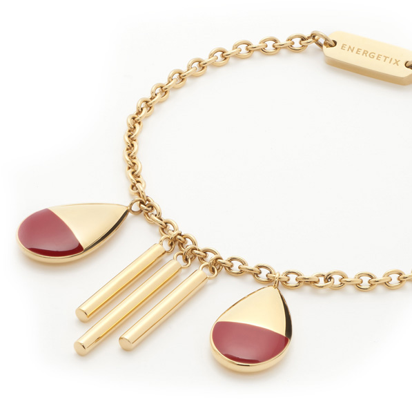 Odstínem zlaté barvy, která byla sloučena na tomto náramku se silnou červenou, byl vytvořený jedinečný dizajnový kousek. Dva přívěsky ve tvaru kapky dělají tento šperk absolutním poutačem. Neporovnatelný náramek, který fascinuje svým působivým dizajnem.