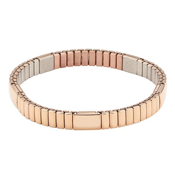 Leštěná povrchová úprava na náramku v růžovém odstínu. Náramek je flexibilní. Různě velké prvky, v kterých jsou vedle sebe v úzké a širší vazbě, vytvářejí vizuální rozmanitost. Módní a atraktívní náramek na všechny příležitosti.