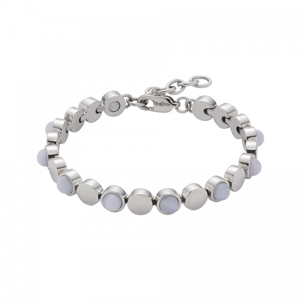 Náramek s vysoce kvalitními drahokamy. Tento náramek se skládá z kulatých prvků z chirurgické oceli, jejichž leštěná povrchová úprava vytváří mimořádně elegantní a nadčasový vzhled. Skutečnost, že se střídají se světle-modrými kulatými achátovými kameny, které mají broušený kabošon, vytváří neobyčejný vzhled, který je velmi přizpůsobivý a snadno kombinovatelný.