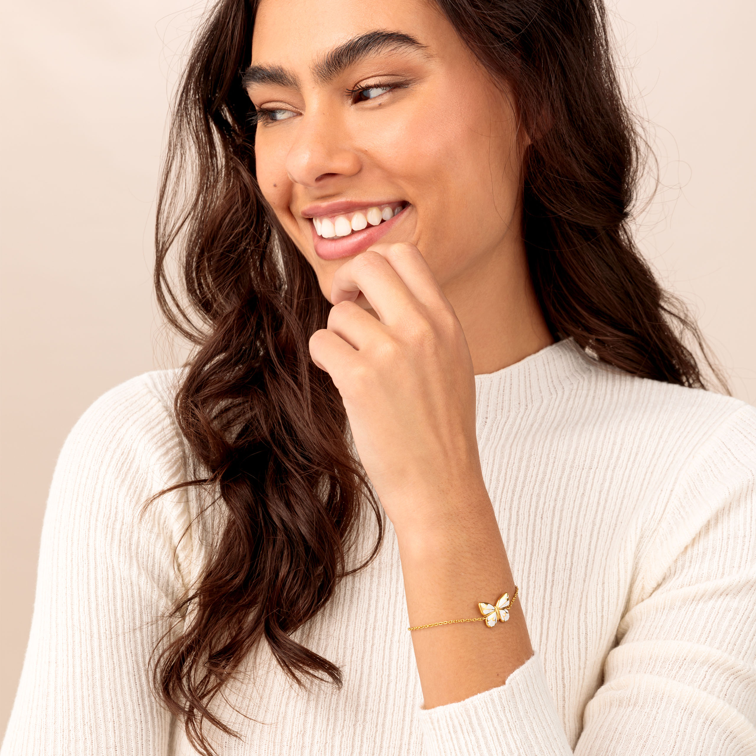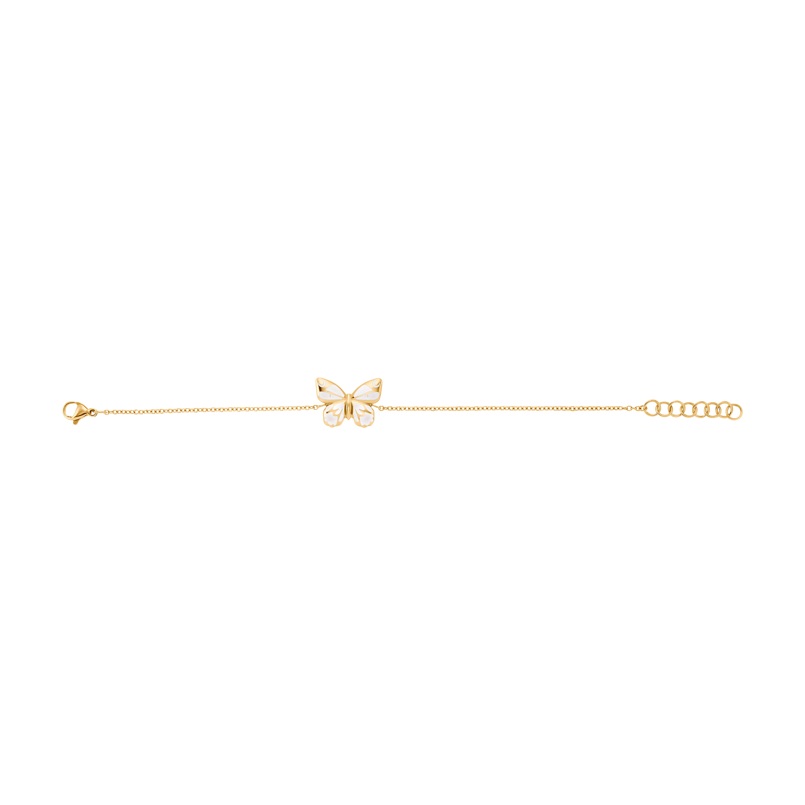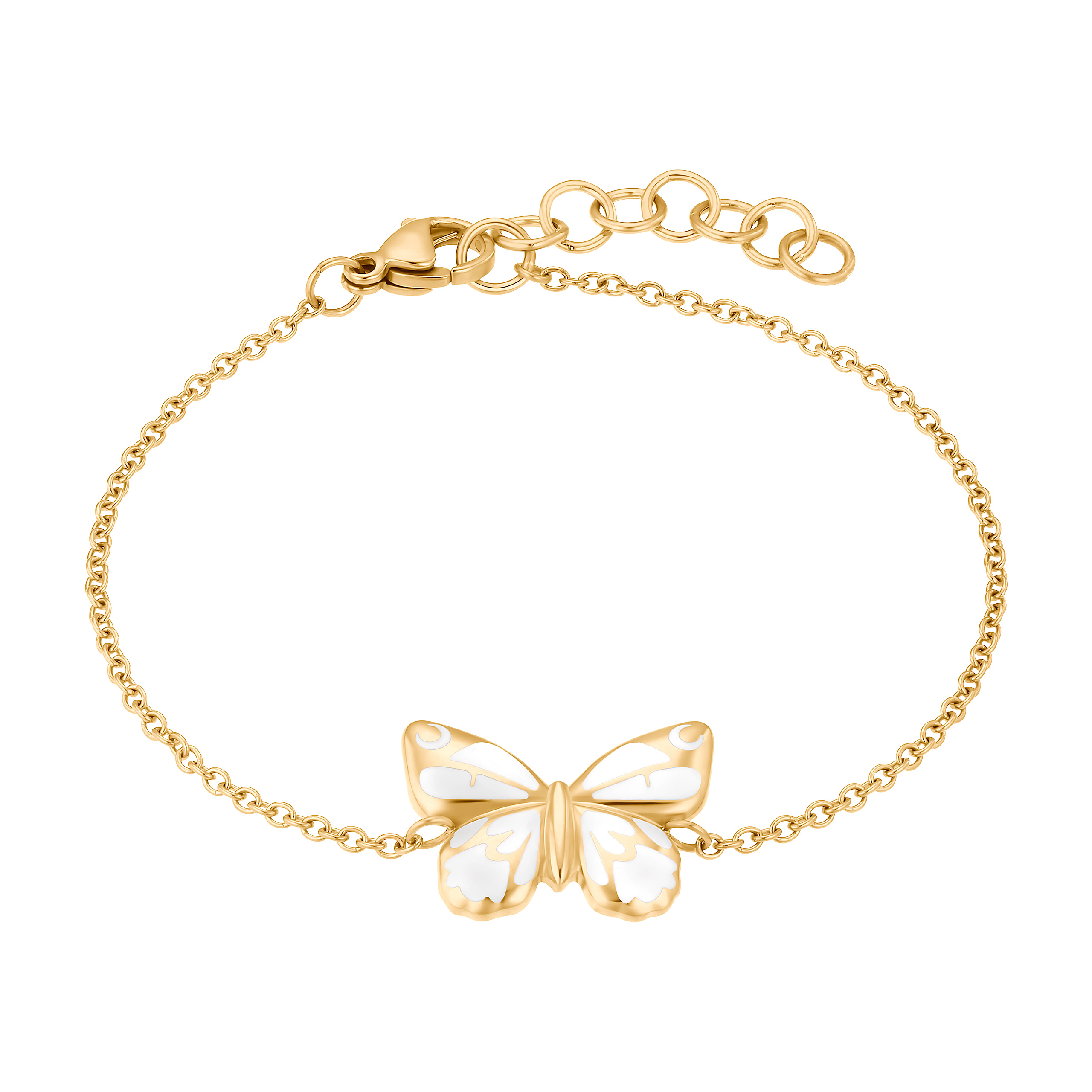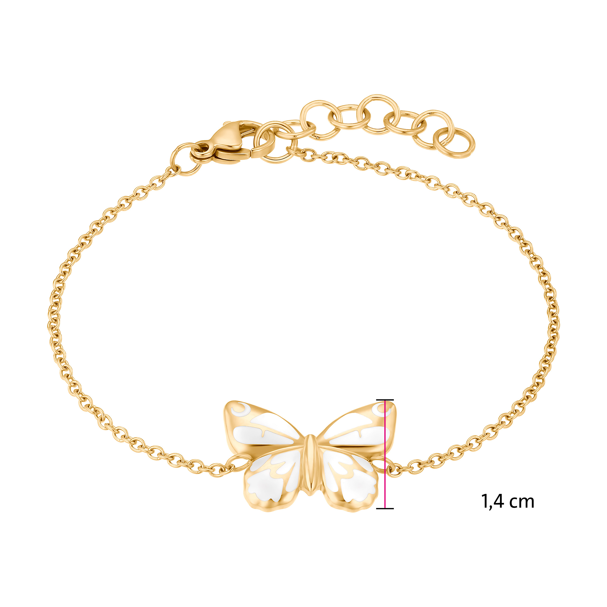 Vrcholem tohoto magnetického náramku je motýl, který je krásně zvýrazněn kombinací bílého studeného smaltu a leštěného povrchu zlaté barvy. Praktické: díky prodlužovacímu řetízku si můžete náramek individuálně přizpůsobit svému zápěstí.