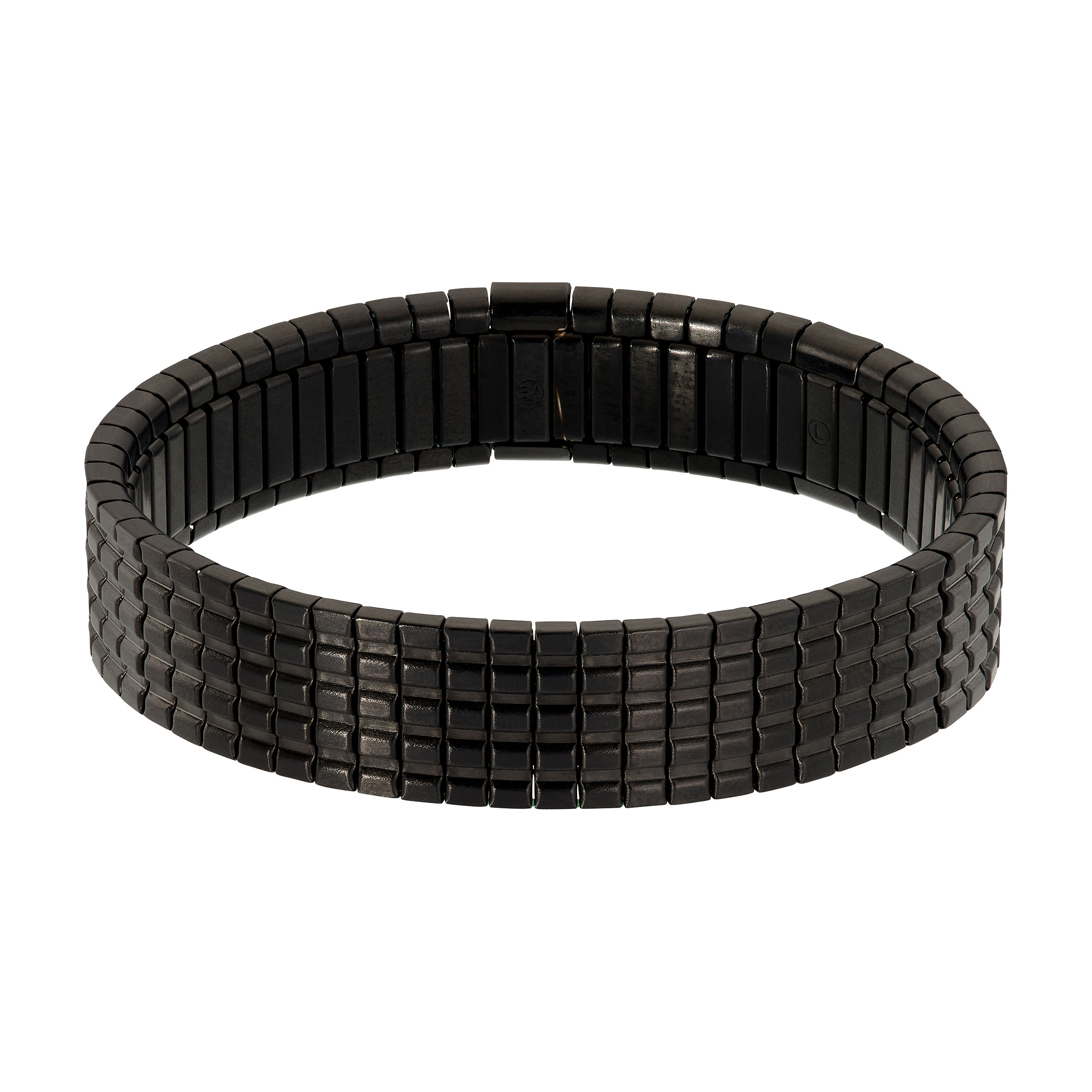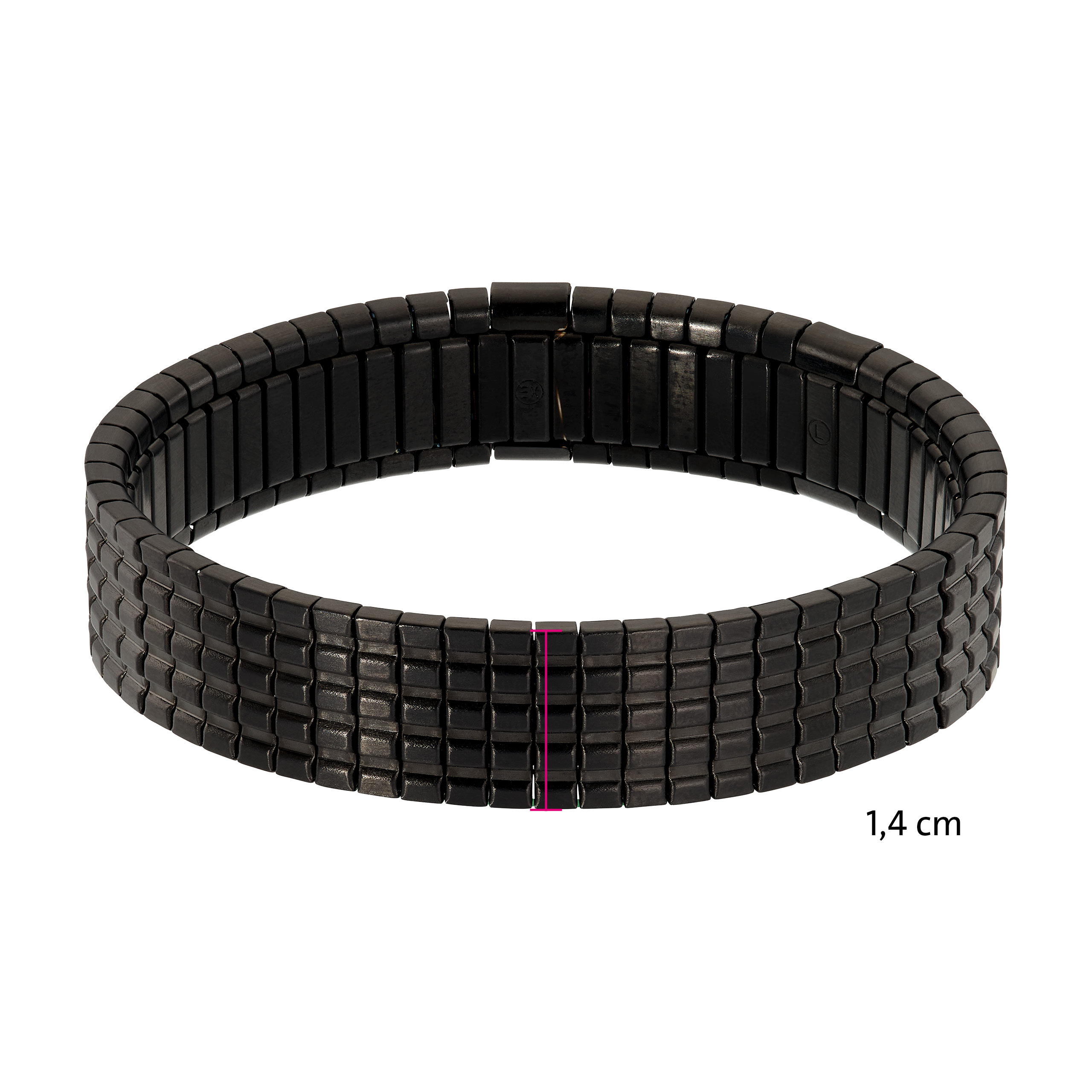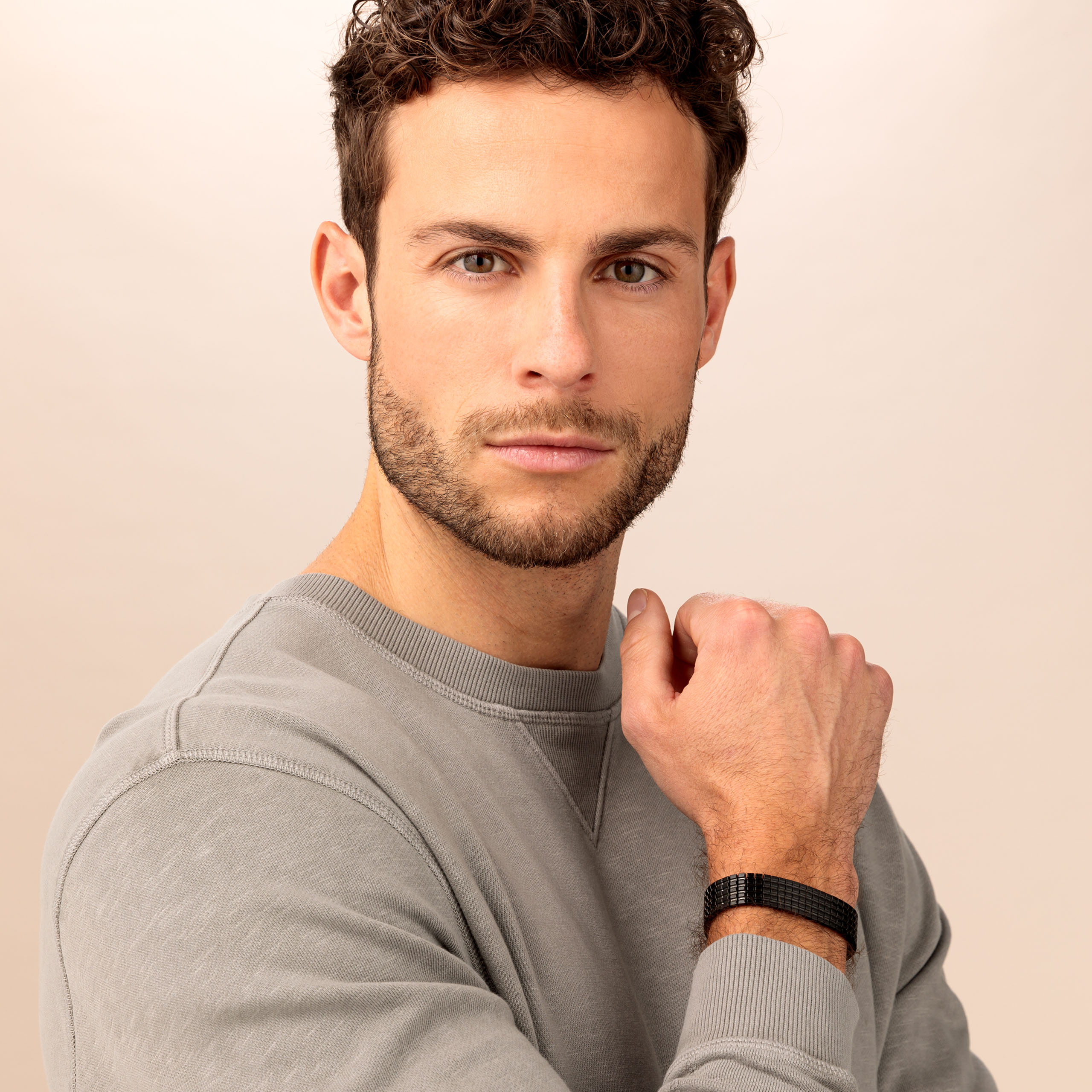 Flexibilní náramek z černé chirurgické oceli je obzvláště moderní díky broušenému povrchu. Skutečným vrcholem je nadčasový vzor Caré na povrchu, který je tvořen mnoha jemnými liniemi a dodává tomuto šperku obzvláště nevšední vzhled.
