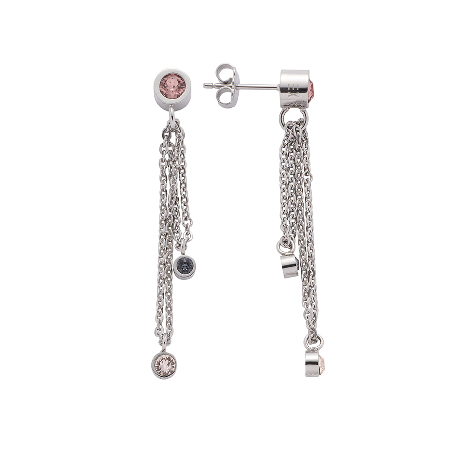 Tyto jemné náušnice jsou nádherně lehké, ale díky zářivým pastelovým krystalem okamžitě upoutají pozornost. Krystaly byly zavěšeny na jemných řetězcích a nádherně harmonizují s leštěnou povrchovou úpravou z chirurgické oceli, aby vytvořily celkově harmonický a velmi moderní vzhled.
